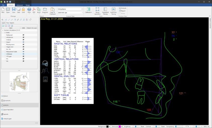 Haga informes de sus radiografías, cree proyecciones de crecimiento del cráneo, planes de tratamiento, predicciones y simulaciones, además, estudie el resultado general de su tratamiento.